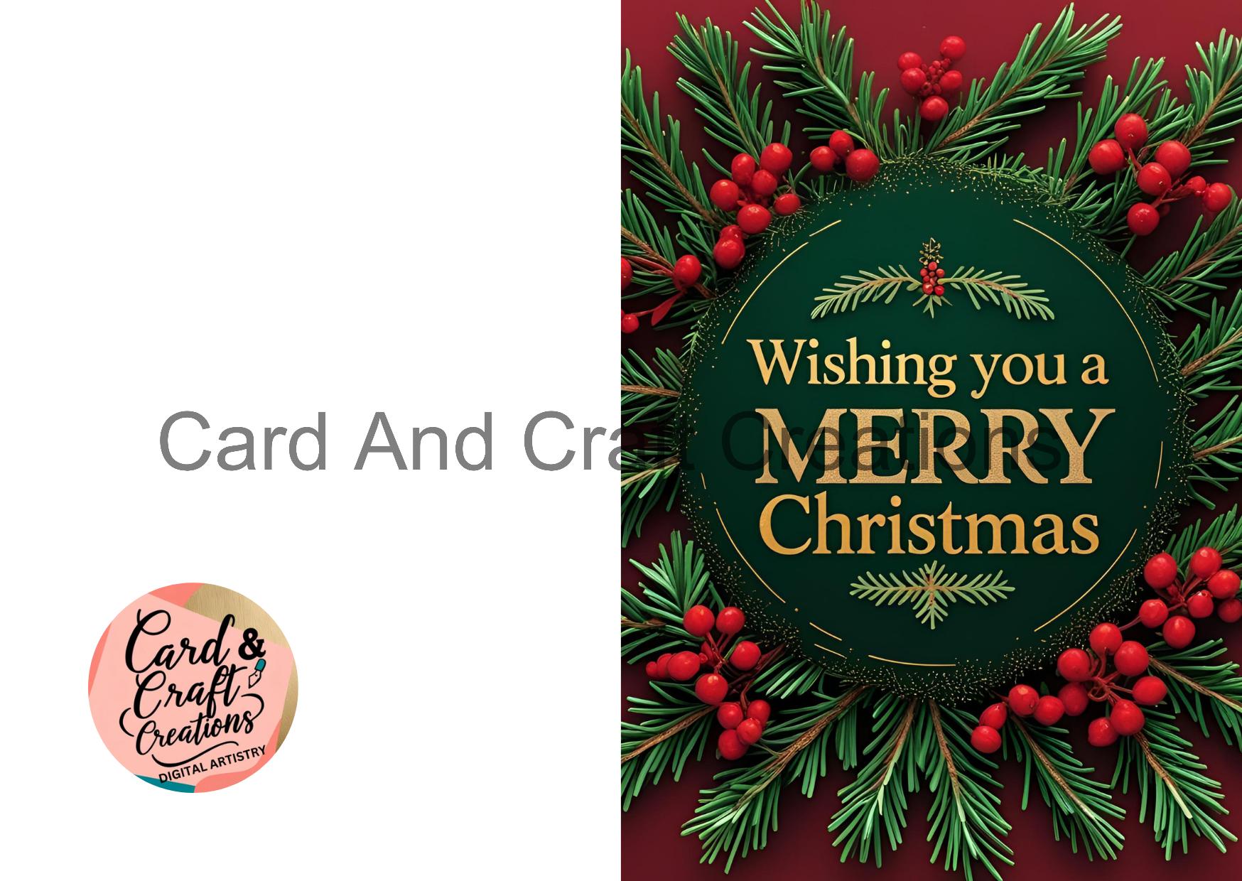 Elegant and festive, this card features a traditional Christmas wreath of pine and holly wrapped around a warm golden greeting. A timeless holiday keepsake.