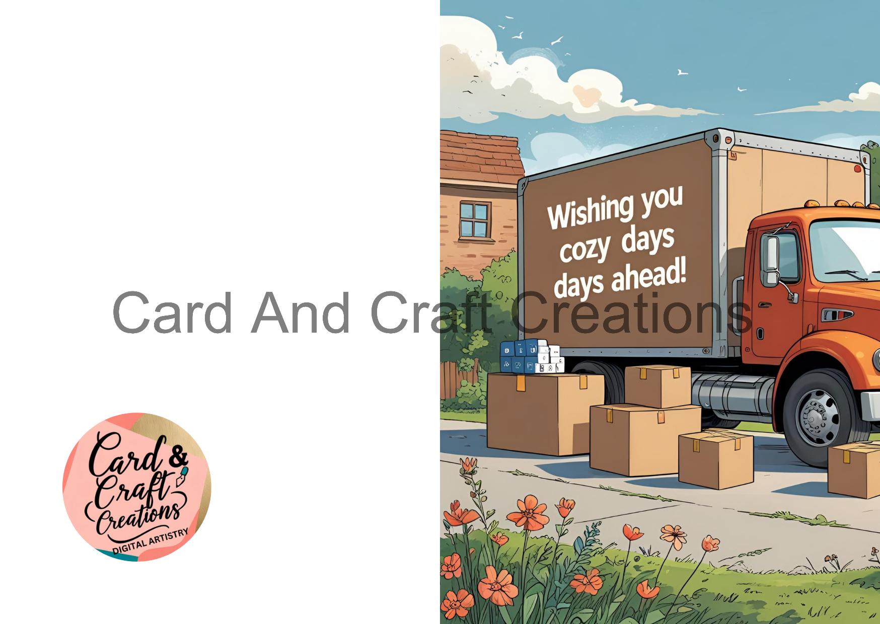 This charming card captures the excitement of moving day with a truck, moving boxes, and blooming flowers. The heartfelt message, “Wishing You Cozy Days Ahead,” makes it a thoughtful card for any new homeowner.