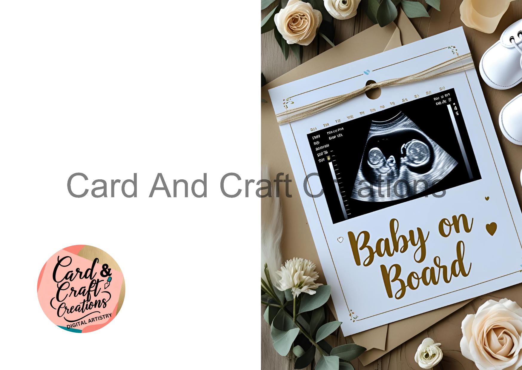 Announce your pregnancy in style with this elegant “Baby on Board” digital announcement card featuring a framed ultrasound design, gold lettering, and floral accents. A modern yet timeless design that makes your special news shine.
