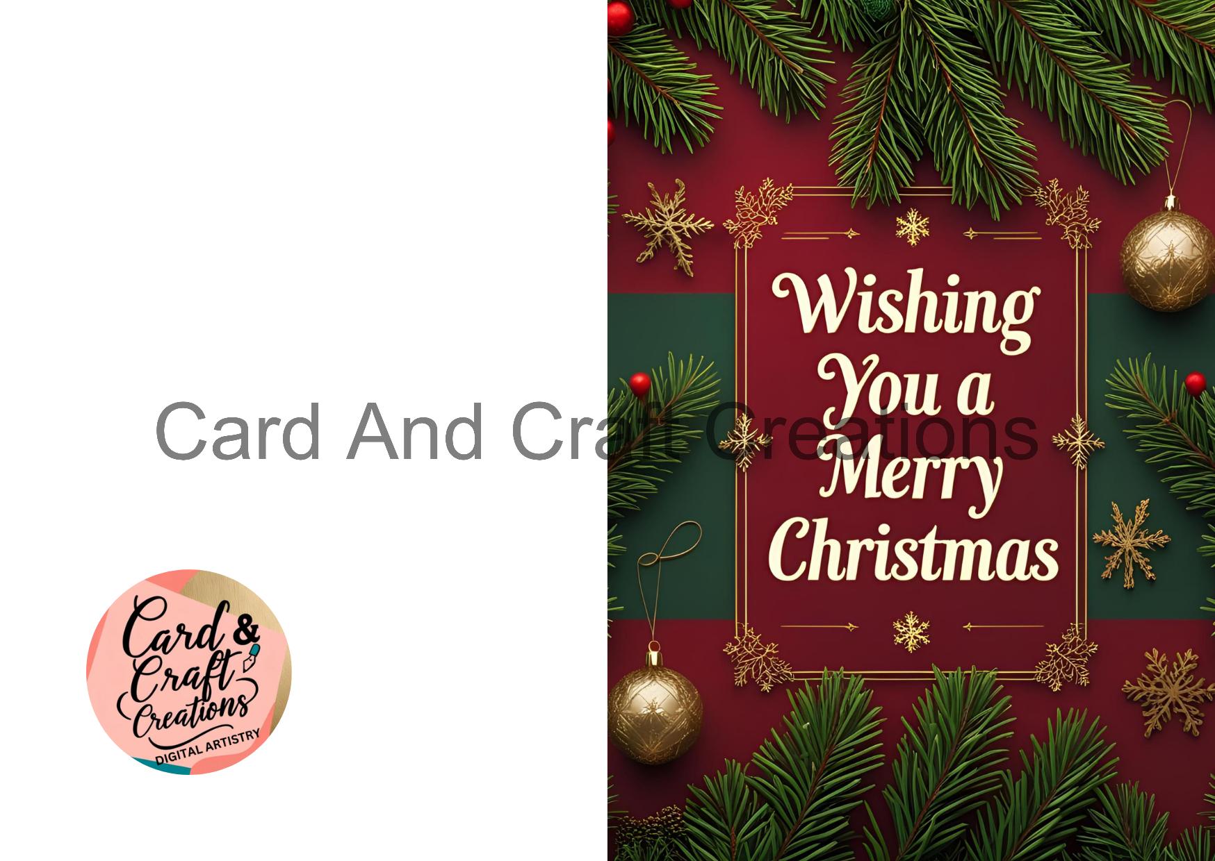 This rich design features golden ornaments, snowflakes, and pine branches framing your heartfelt wishes. A luxurious card for spreading Christmas warmth.