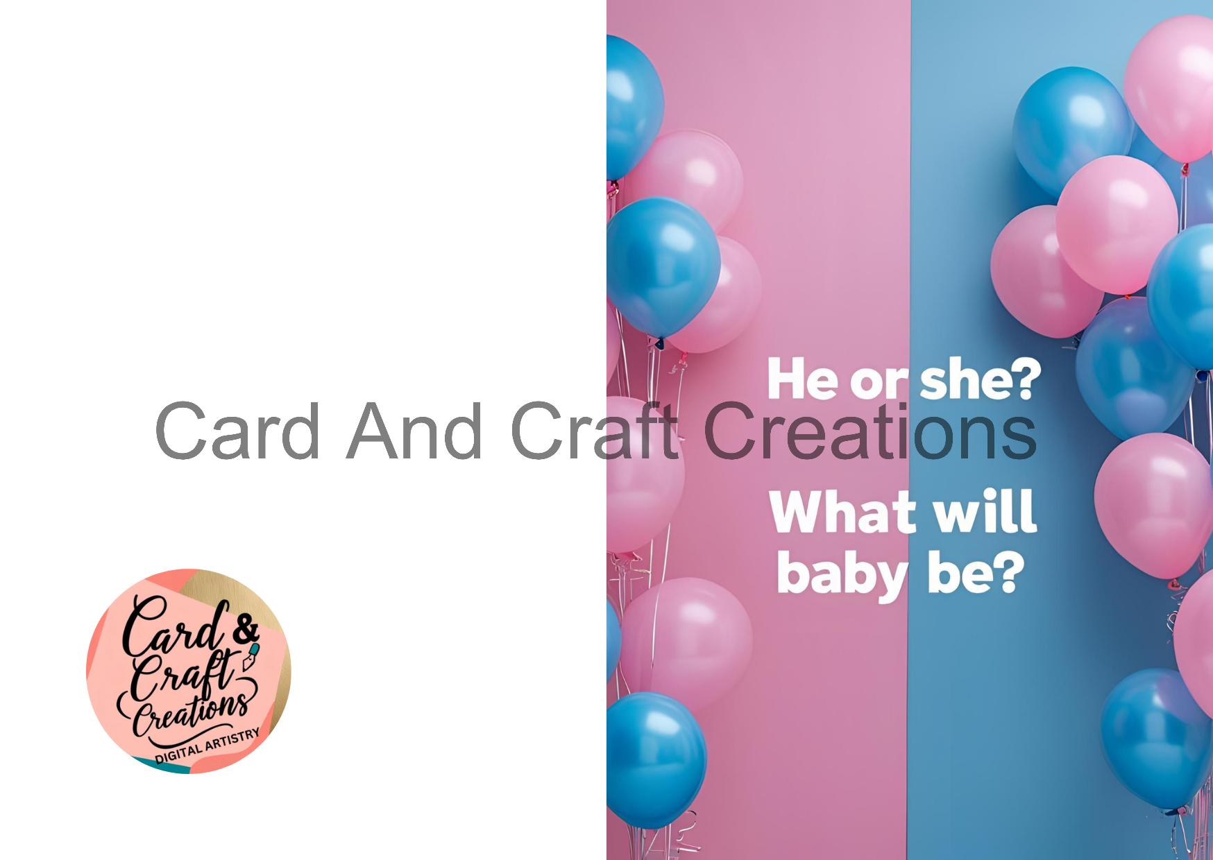 A charming design featuring soft pink and blue hues, this card is perfect for announcing or celebrating a gender reveal. A fun way to share the excitement!