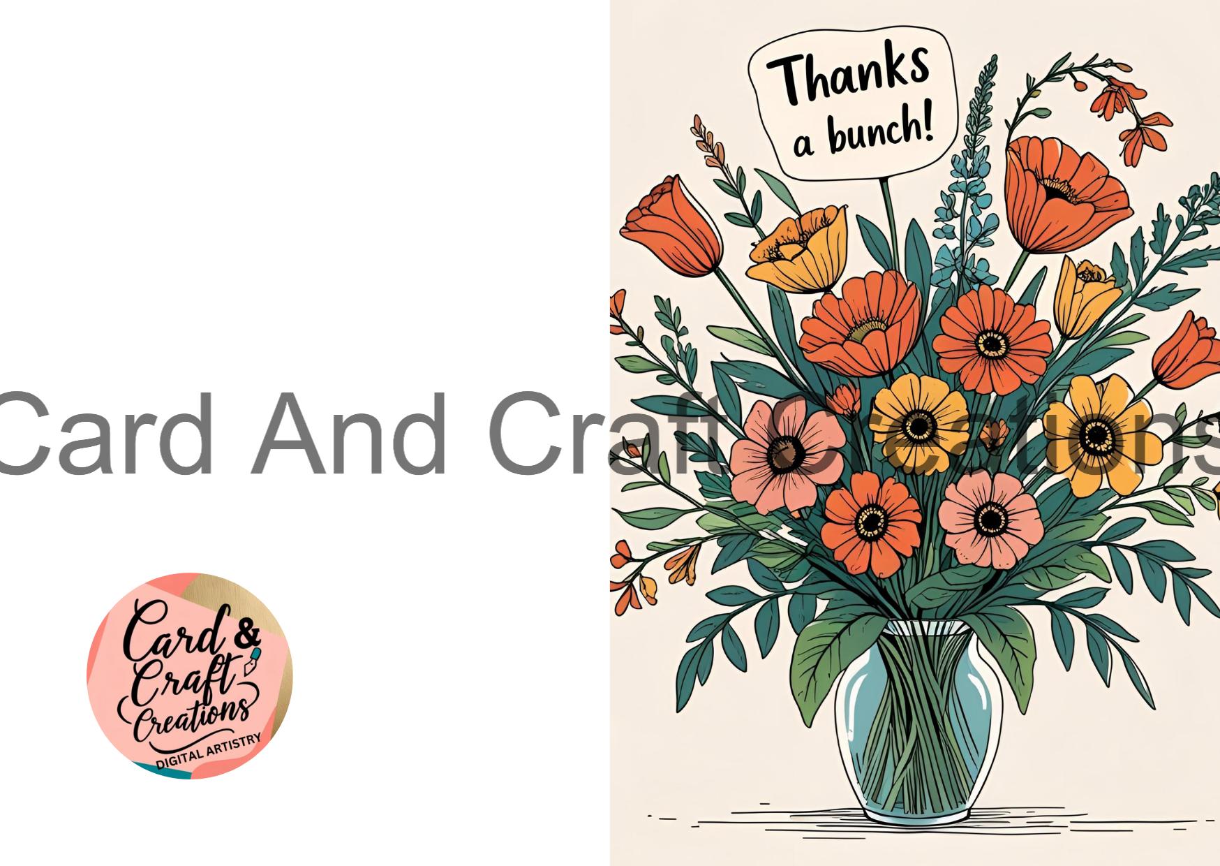 A charming hand-drawn style thank you card featuring a vase of bright flowers and a speech bubble with 'Thanks a bunch!'.