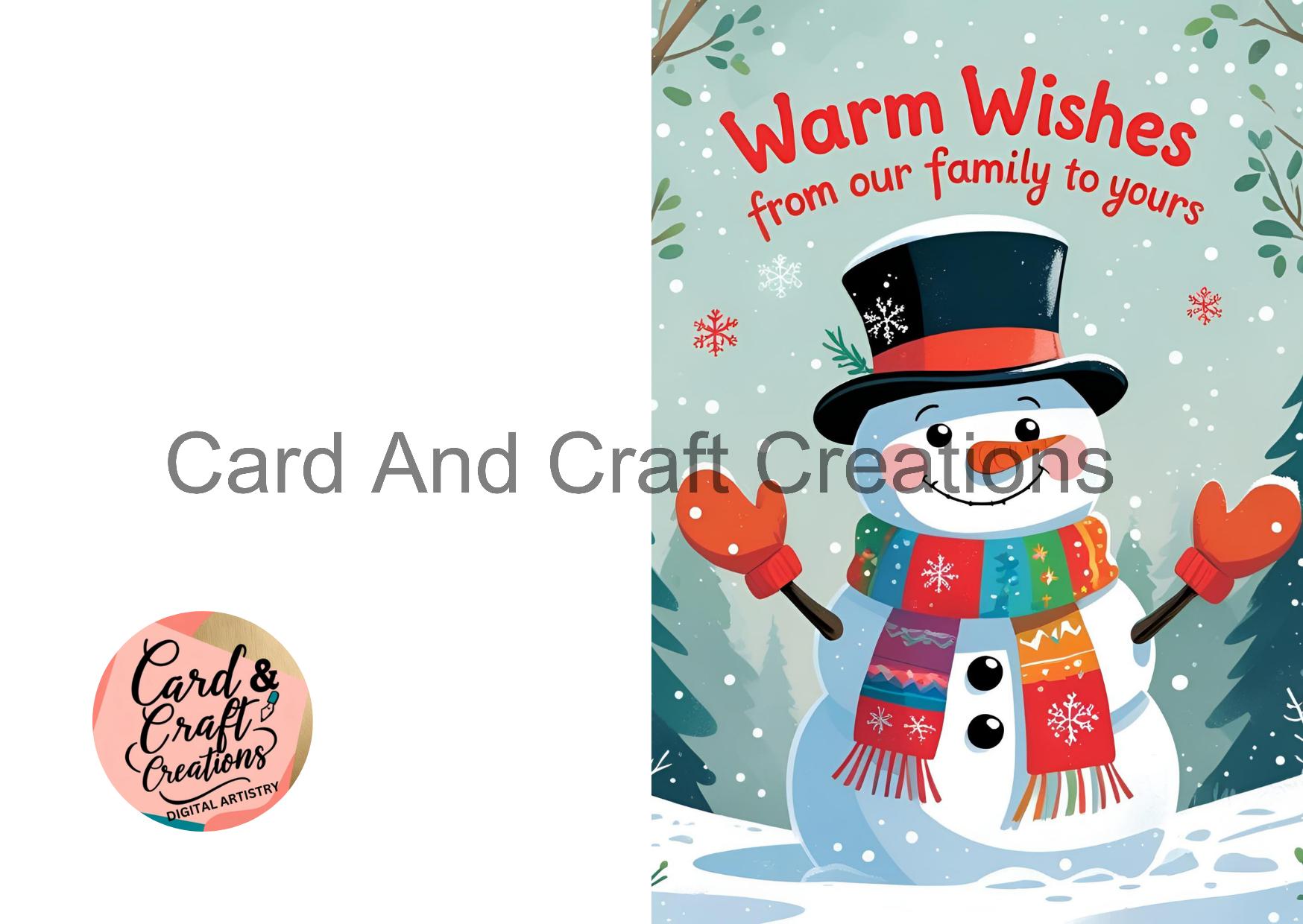 Full of fun and color, this jolly snowman in a patterned scarf and hat brings festive cheer to your loved ones. A delightful card for all ages!